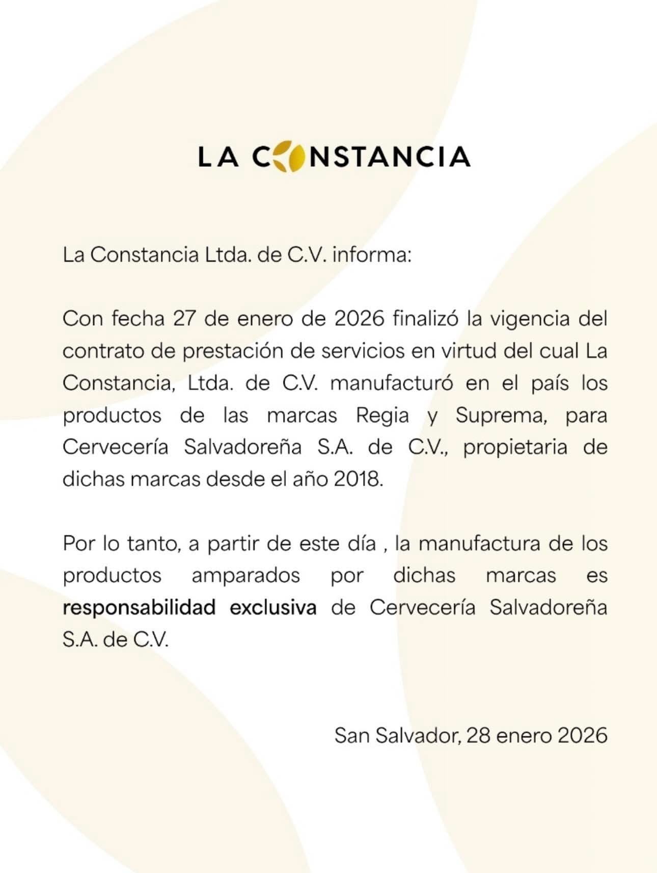 Mediante un comunicado oficial, la empresa confirmó que el contrato de prestación de servicios de manufactura finalizó el martes 27 de enero de 2026, fecha hasta la cual La Constancia fabricó ambos productos en territorio nacional. Desde el 28 de enero, la responsabilidad exclusiva de producción pasa a manos de Cervecería Salvadoreña S.A. de C.V., propietaria de las marcas desde el año 2018.
